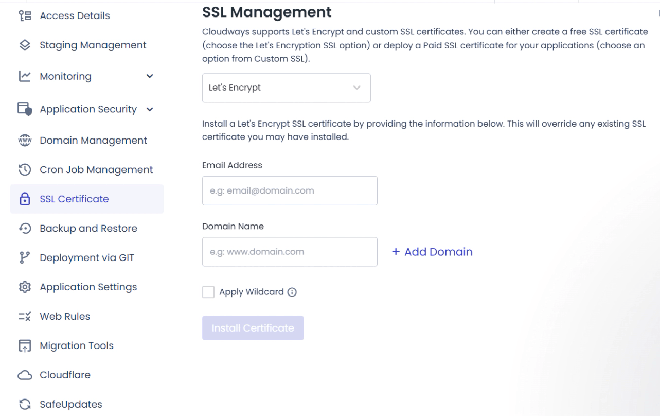 클라우드웨이즈 마이 어플리케이션 누르면 보이는 ssl certificate에서 어떻게 보이는지 화면을 캡쳐해서 보여주실 수 있나요? domain management 화면도 같이 보여주세요!