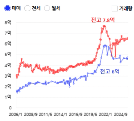 빨간색 - 매도 시 투자 가능한 단지 전고 7.8억