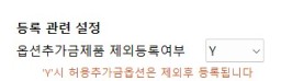 우선 저 오류의 뜻은 지옥션에서 정한 옵션 가격 범위가 있는데 그 범위를 벗어나면 오류가 발생합니다. 다만 이 오류가 안나오게 할려면 사진과 같이 유플랫 설정에서 Y로 해주시면 옵션 가격 범위를 벗어난 옵션을 제외하고 등록하게되어서 오류 없이 잘 등록하실 수 있으십니다. 저도 Y로 하고 등록하고 있습니다ㅎㅎ