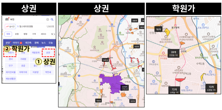 두 번째 사진은 호갱노노의 ‘상권’, ‘학원가’ 탭을 클릭한 화면입니다.