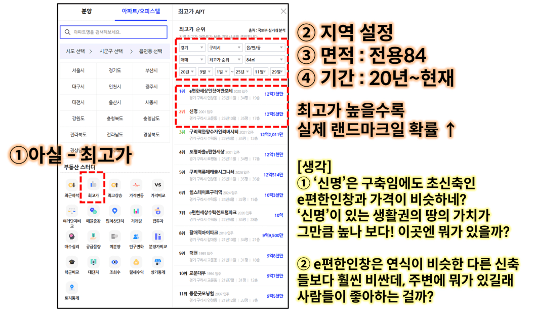 아실 최고 실거래가 순위를 보고 사진에 적어둔 것처럼