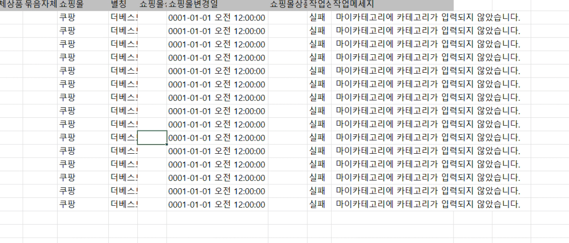 여기에 다 쿠팡카테는 등록이 되어있는데도 엑셀에는 마이카테가 등록이 안되어 있다고 떠서요 ㅠ