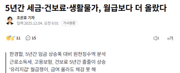 기사에서는 최근 5년간 근로자 월 임금이 연평균 3.3% 증가(2020년 352만7000원→2025년 415만4000원)하는 동안 월급에서 원천징수되는 근로소득세와 사회보험료의 합은 연평균 5.9% 증가(2020년 월 44만8000원→2025년 59만6000원) 상승했다고 하는데요