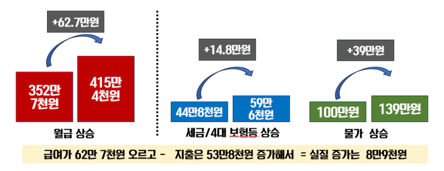 그러니까 ~ 월급 62만원이 오르면 세금과 4대보험료등은 15만원가까이 오르게 되고 , 또 전기·가스·식료품·외식비 등 필수생계비 물가는 연평균 3.9% 상승했다고 하니 결국 월급이 올라도 사용할 수 있는 돈의 양은 크게 늘지 않는 현상이죠 .