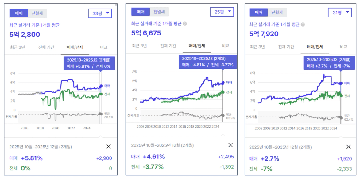 짧은 시간이지만 매매는 오르고 전세가 떨어져 이제는 투자금이 더 필요한 단지들이 되어버렸습니다.