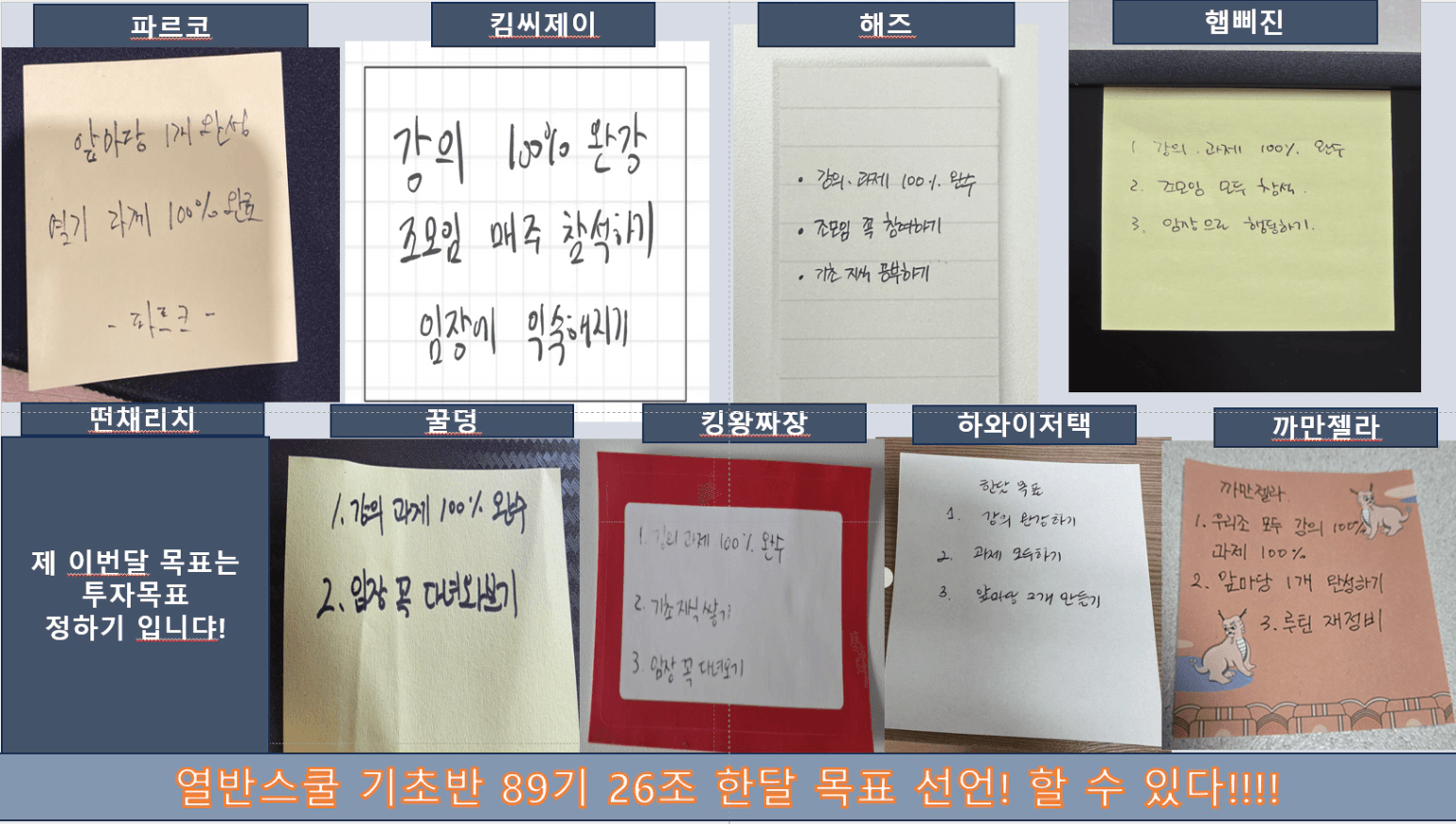 처음 시작 하는만큼 조장님 및 조원분들과 함께 한달 목표 꼭 이루도록 노력하겠습니다!