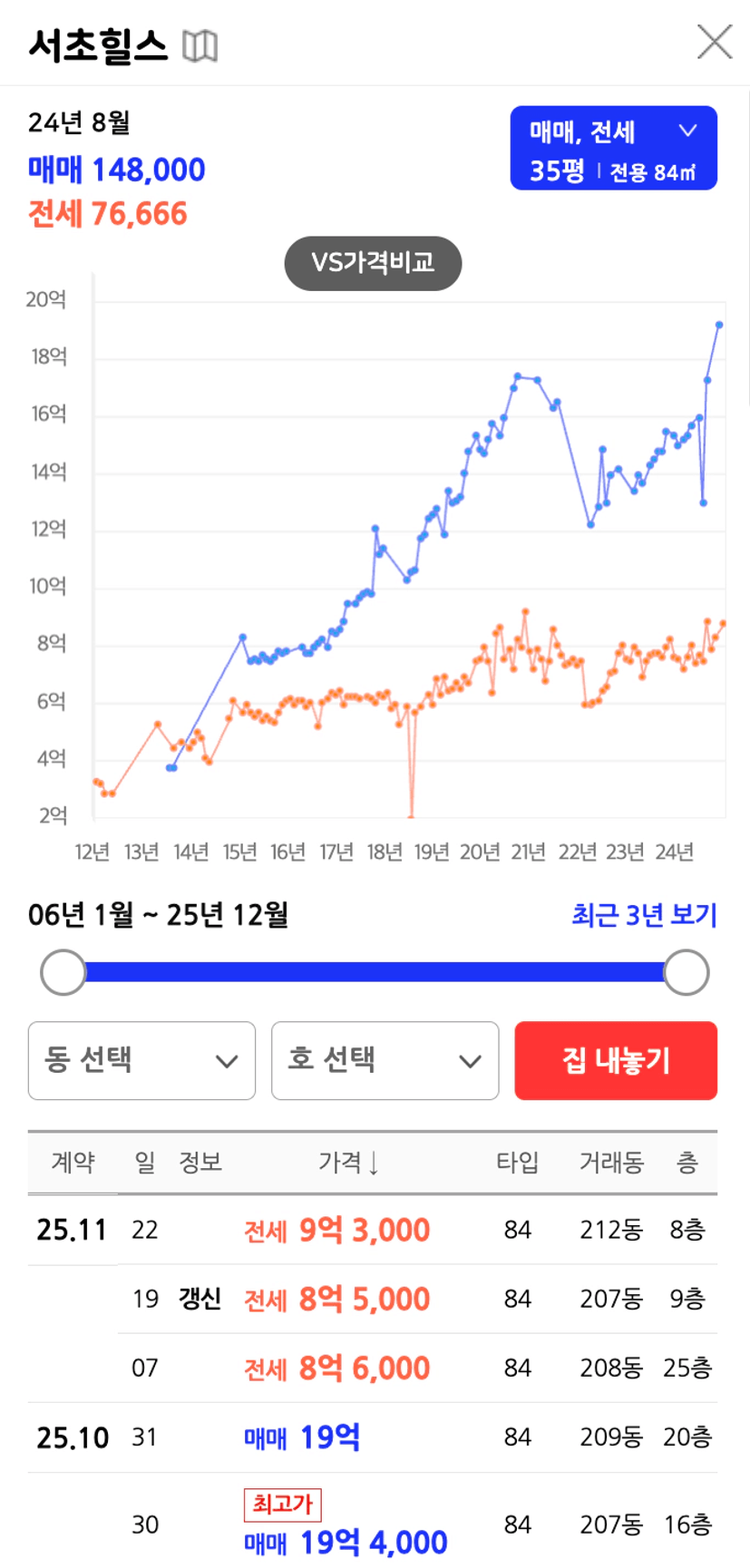 • 인근 단지인 서초힐스(서초구 우면동, 2012년식, 전용 84㎡): 최근 실거래 19.4억
