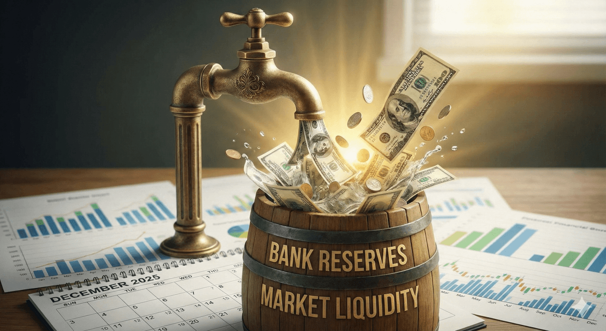 이게 무슨 의미냐 하면, 재무부라는 거대한 댐의 수문이 열렸다는 소리다. 재무부 잔고가 내려가면서 시중에 유동성 물결이 다시 밀려오고 있다. 그 돈이 돌고 돌아 어디로 가느냐? 결국 다시 은행으로 들어간다. 그래서 유동성 지표인 지급준비금 계좌를 다시 두둑하게 채우고 있다.
