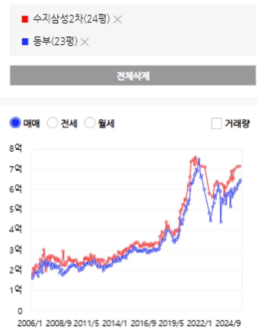 예시를 들기 위해 '용인시 수지구' 아파트 2개를 들고 왔는데요.