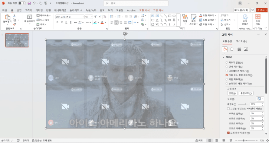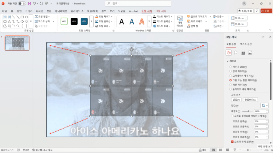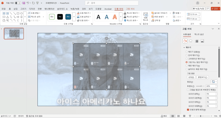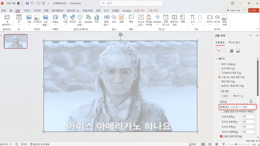 오른쪽에 "투명도"를 60%로 바꾸면