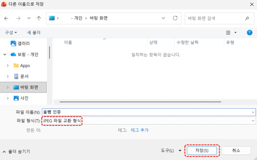 파일 형식을 "JPEG 파일 교환 형식"으로 선택 후 "저장" 버튼을 누르면 -
