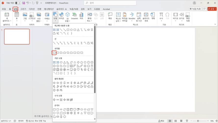 그 중 "사각형"에서 "직사각형"을 클릭해줍니다.