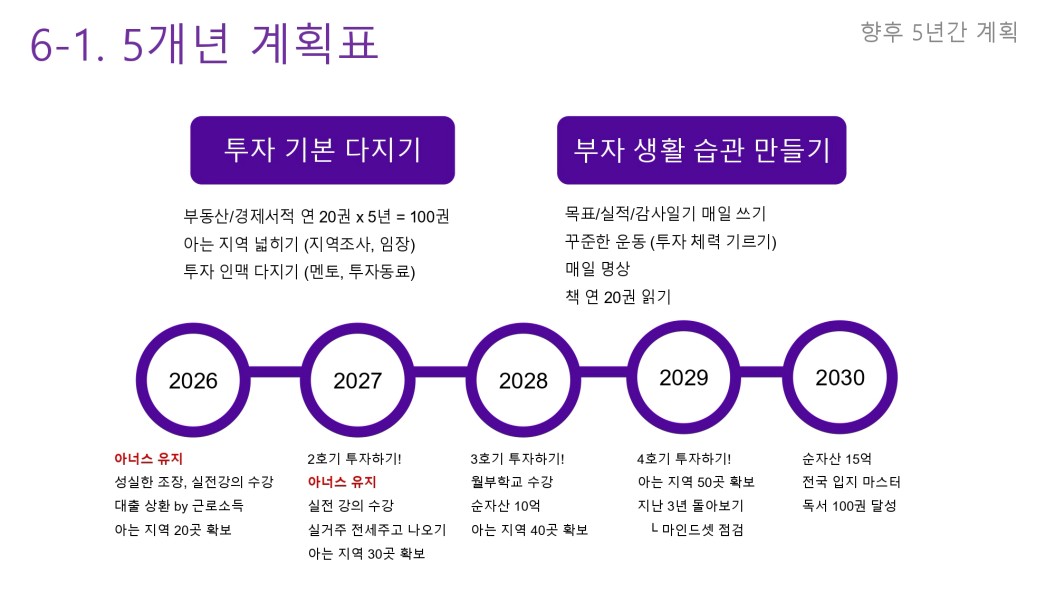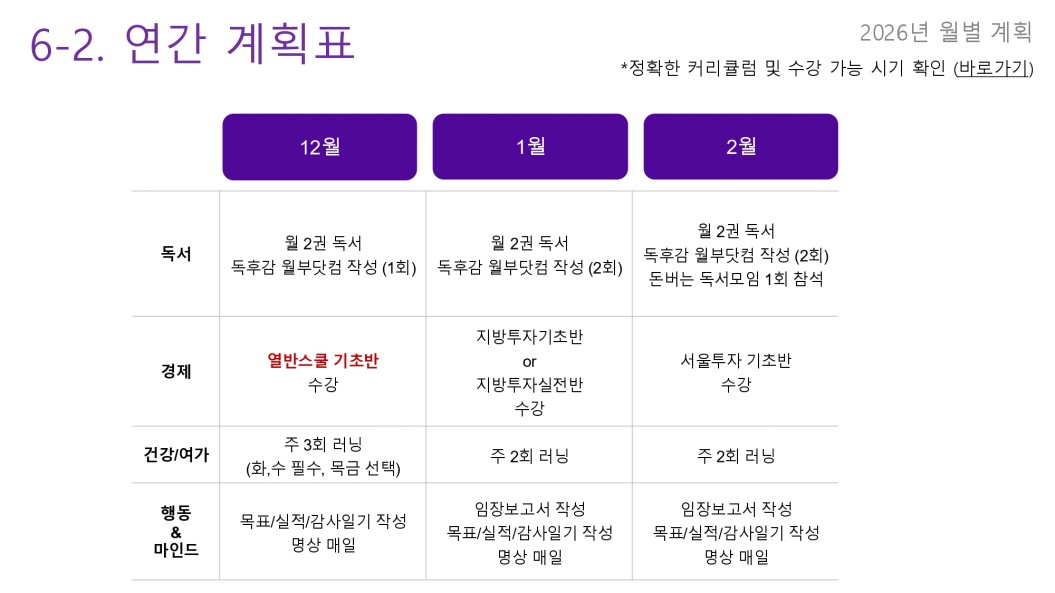 - 투자: 서울투자 기초반 수강 or 열반스쿨 실전반 수강, 아는지역 1개 만들기