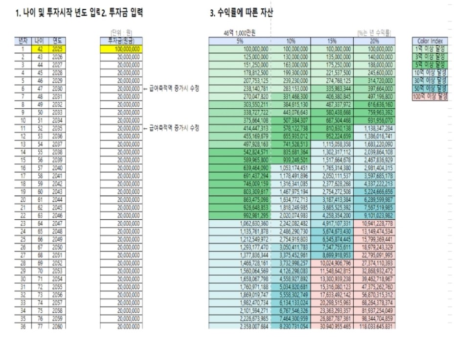 목표 금액 41.6억 (현재 나이 42세, 연저축액 2000만원에서 시작)