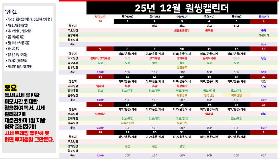 독서는 하루에 10P 라도 읽었다면 좋았을텐데 역시나 시간 조율 실패….하루에 한장도 읽을 수 없었습니다. 이 부분이 많이 아쉽네요, 전임은 목표를 이루긴 했으나 실거주 컨셉이라 처음에는 어려웠고 , 나중에는