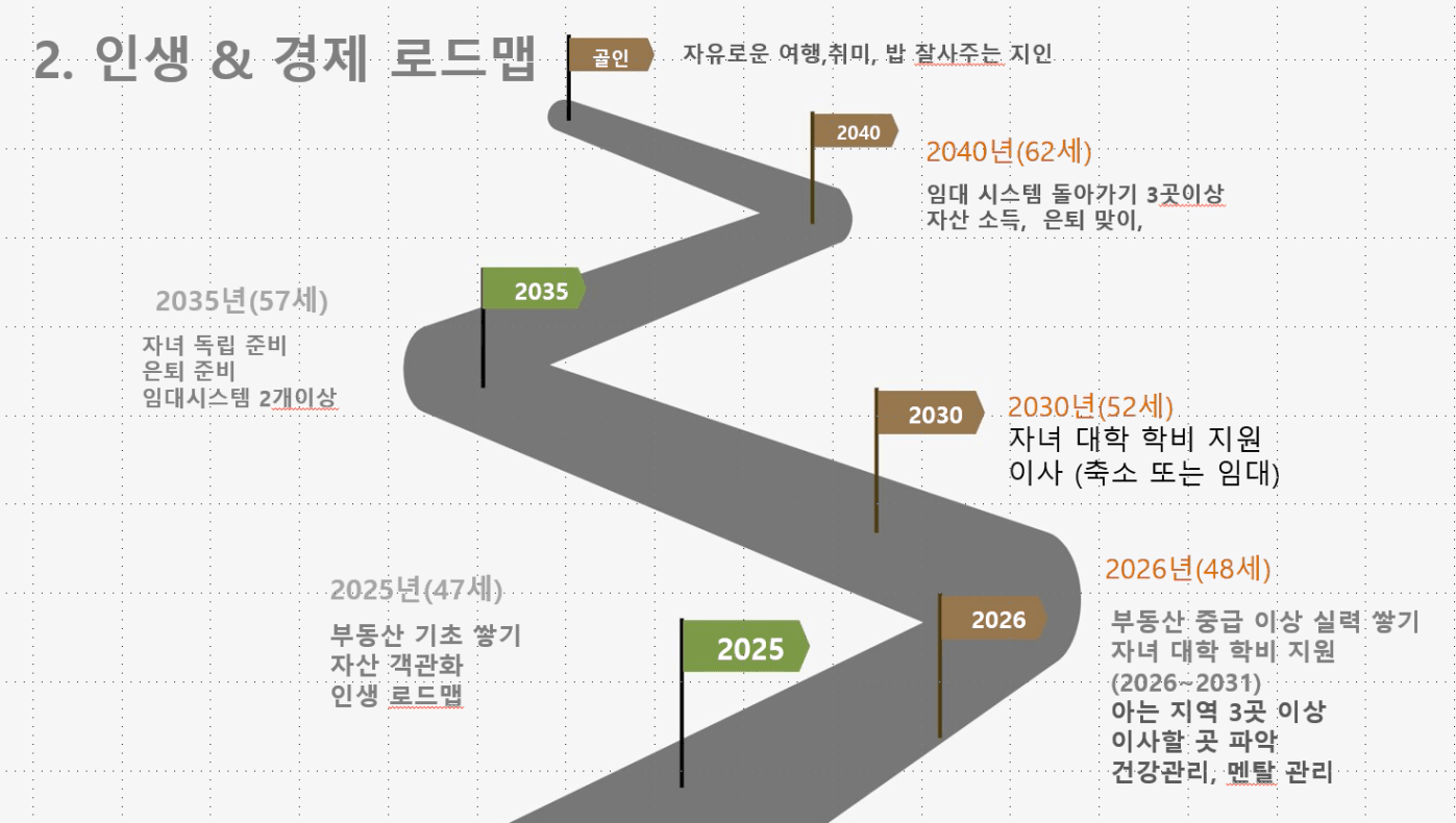 비전보드 실현을 위해 5년 단위로 20년 계획을 세워봅시다. (2025/ 2030/ 2035/ 2040/ 2045년)