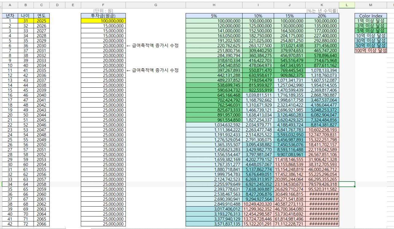 - 수익률 20%: 47세 (2041년)