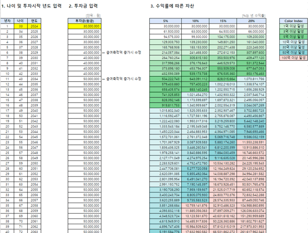 목표 금액 41.6억 (현재 나이 27세, 연저축액 3000만원에서 시작)
