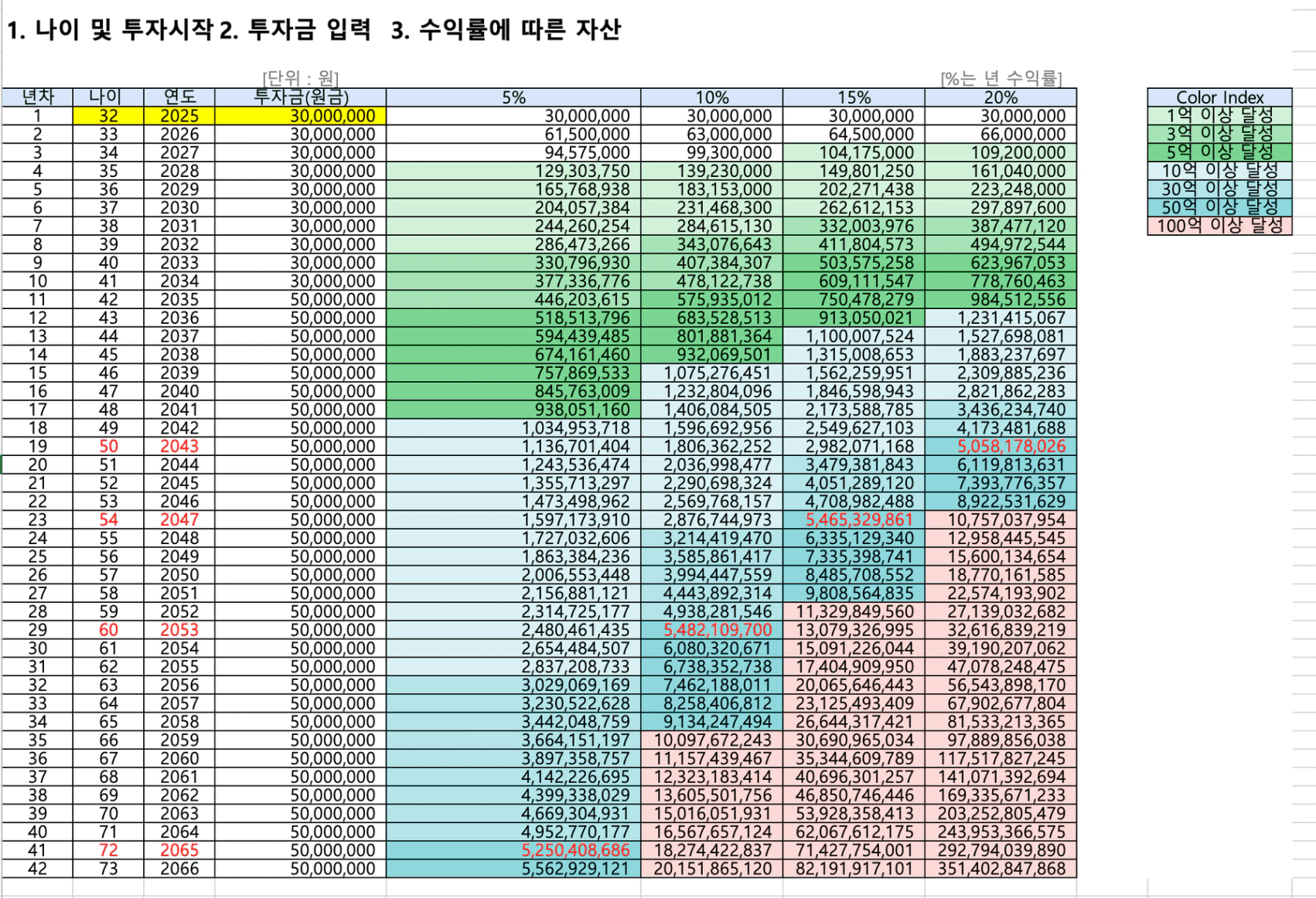 목표 금액 50.6억 (현재 나이 32세, 연저축액 3000만원에서 시작)