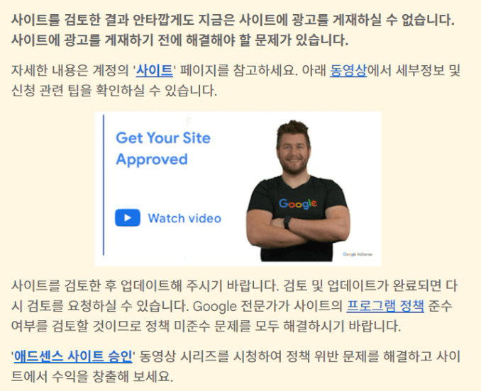 제 이메일로 온 화면이 아래와 같은데 승인 거절된 상태인 걸까요? 그리고 가치가 없는 컨텐츠가 거절된 것이 맞다면 기존 주제 그대로 둔 상태에서 글의 퀄리티를 높여서 계속 포스팅 하면서 다시 승인을 요청하는 게 맞는 절차일까요?