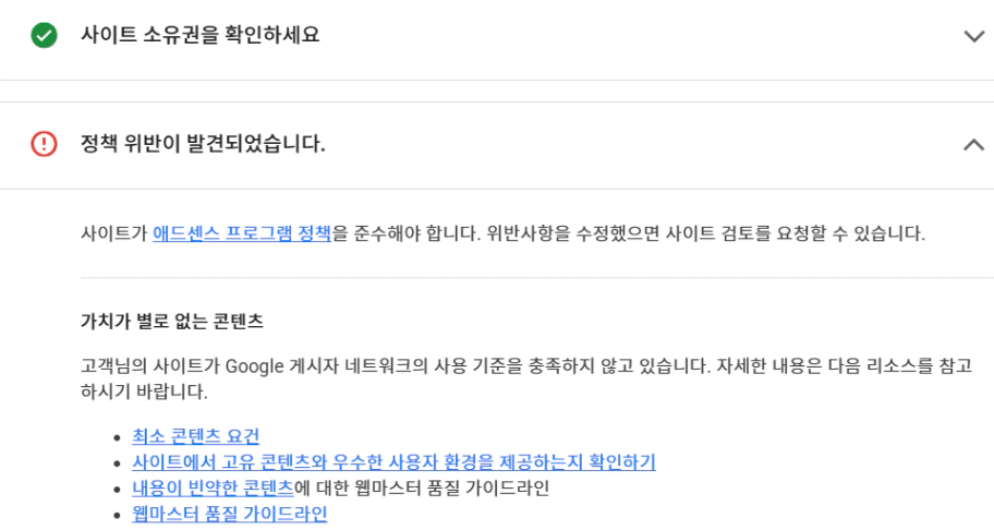 또, 가치가 별로 없는 컨텐츠라고 상태가 바뀌었을 때 원래 정책 위반이라고 뜨는 게 맞는지도 궁금합니다.