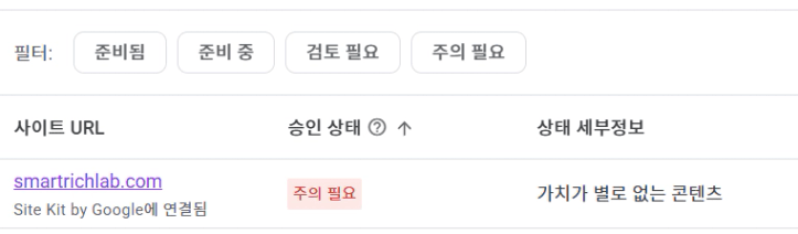 애드센스 승인 요청 이후 20여일만에 상태가 주의 필요로 바뀌었고, 애드센스 사이트에서 보이는 메세지와