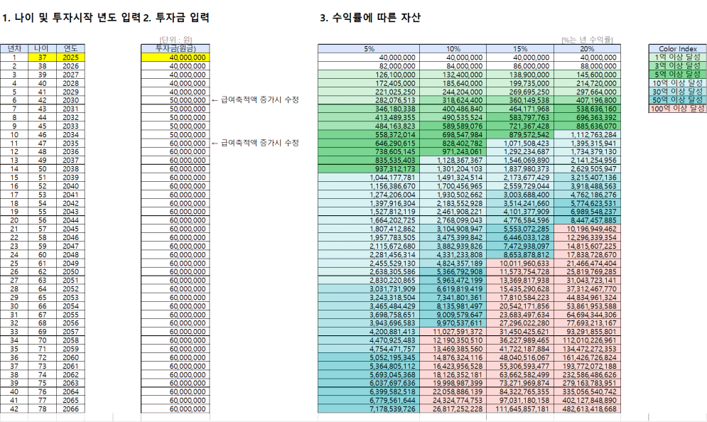 목표 금액 41.3억 (현재 나이 37세, 연저축액 4000만원에서 시작)