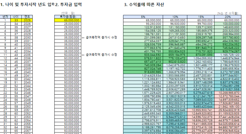 목표 금액 43.1억 (현재 나이 33세, 연저축액 2,500만원에서 시작)