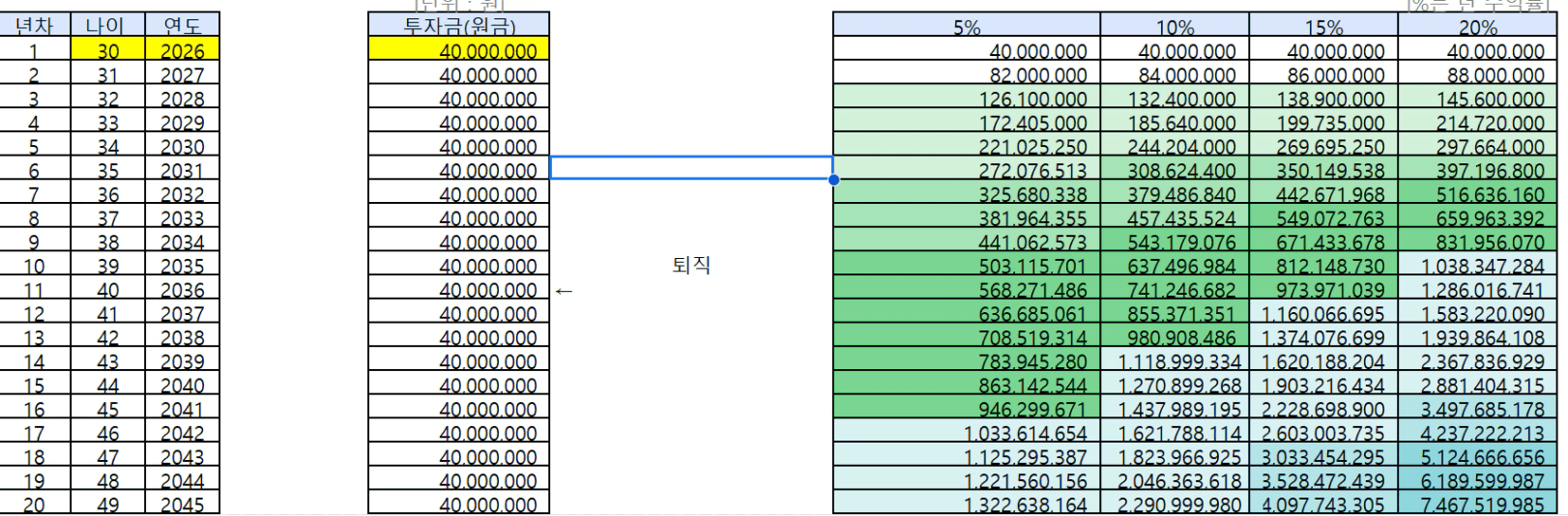 - 수익률 20%: 46세 (2042년)