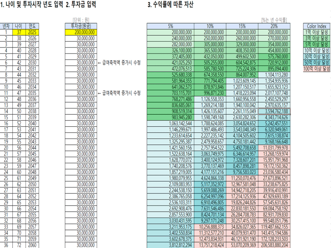 목표 금액 46억 (현재 나이 37세, 연저축액 20000만원에서 시작)