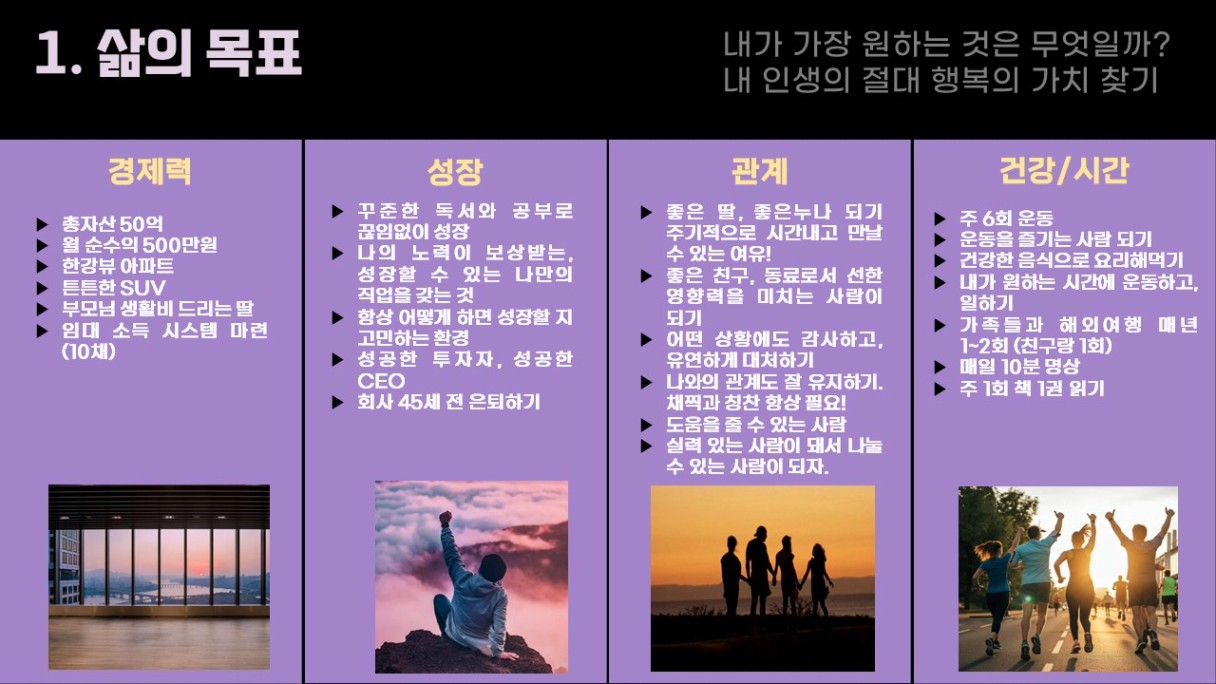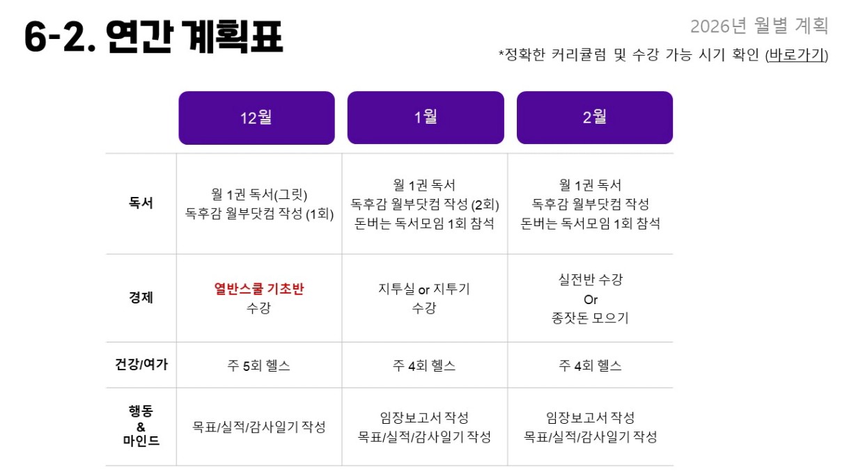 - 인간관계: 매일 10분씩 월부 댓글 응원, 가족 연락하기, 본가 방문