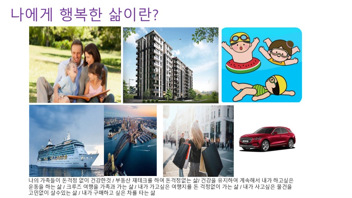ㅡ>나의 행복한 삶에대해 막연하게만 생각했는데 곰곰히 생각해보면 돈없는삶은 행복할 수도 있지만 돈이 기본적으로 갖추어진 삶은 내가 선택할 수 있는 범위도 더 늘어나는것 같아서 돈없이 행복한것보다는 좀더행복하지않을까라는 생각이 들었다. 돈을 열심히 모아야 겠다는 생각을 한번 더 하게 되었다.