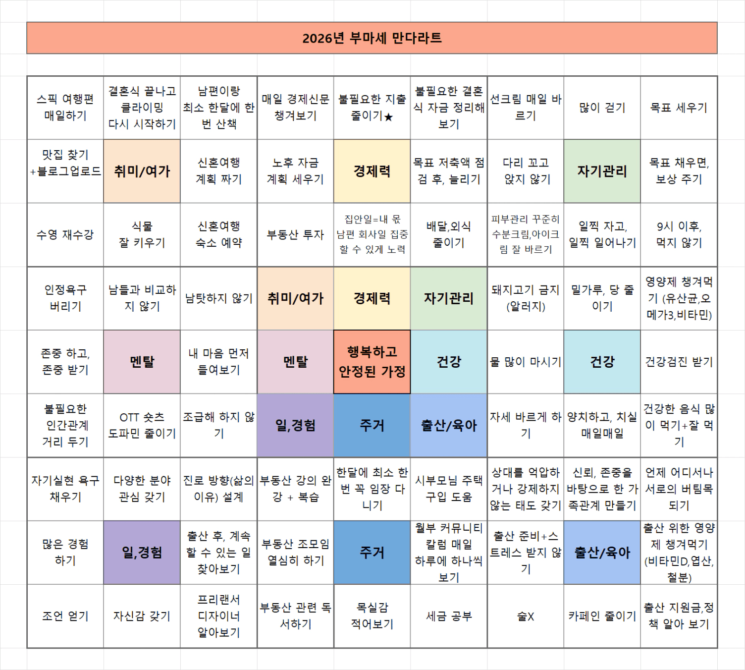 - 투자: 소비 지출 내역 정리, 26년 연간 계획 수립, 임장 다니며 보고서 만들기, 내집마련을 위한 부동산 공부 매진
