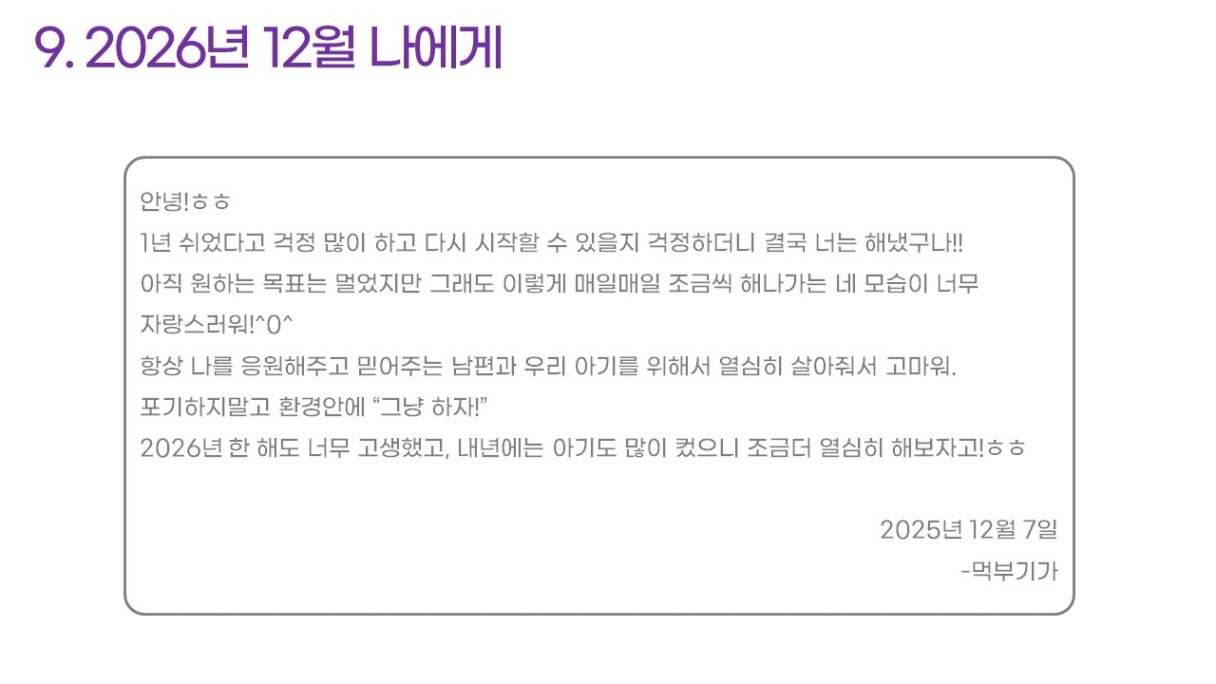 실행력이 정말 좋으시네요. 필사도 하시고, 1년 후의 나에게 쓰는 편지까지... 먹부기님은 꼭 목표달성 하실꺼에요. 에너지와 실행력이 부럽습니다. 저도 잘 따라가 볼께요. 좋은 비전보드 잘 보았습니다.