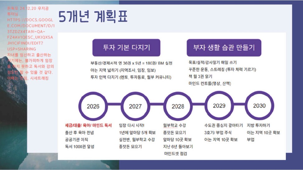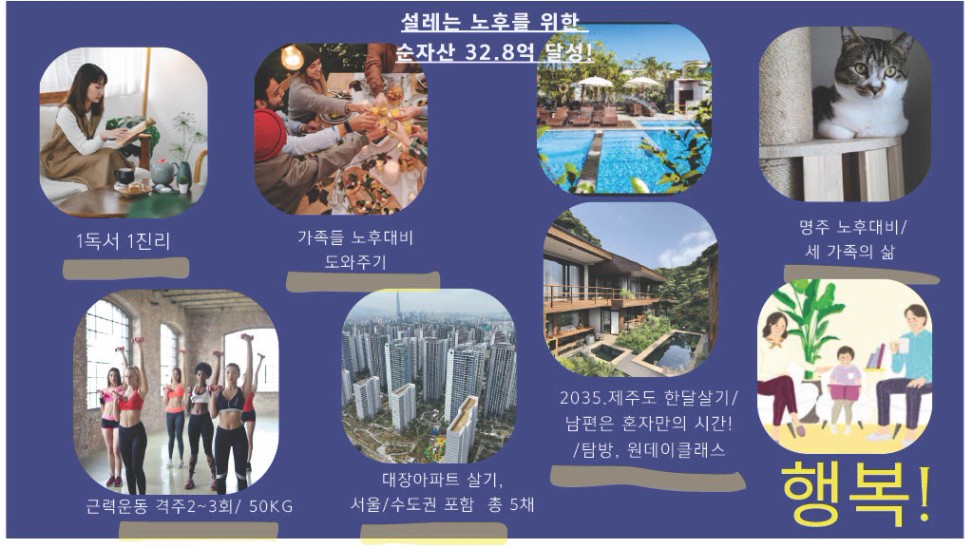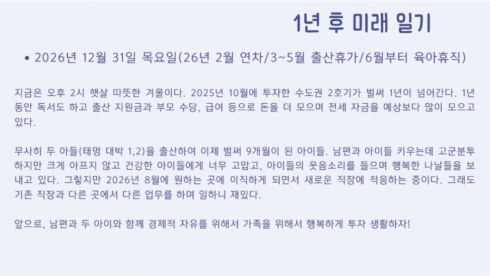 아울러 2022년 4월부터 2025년 현재까지 계획을 보고 앞마당 개수와 수도권 투자 등이 원하는 대로 이루어진 것을 보고, 다시 한번 더 비전보드를 작성하며 경제적 자유와 노후대비의 꿈을 그리게 되었습니다. 2026년도 원하는 대로 이루어지길 바랍니다.