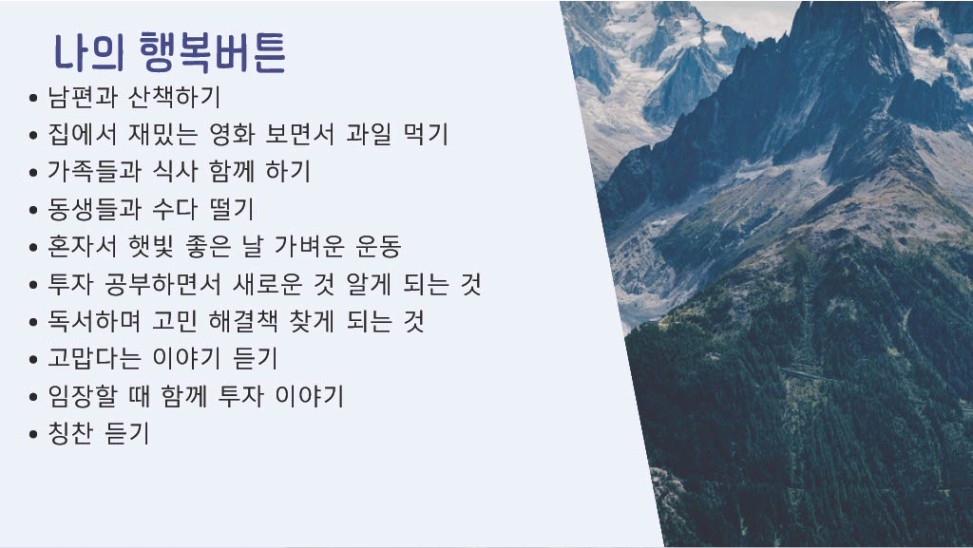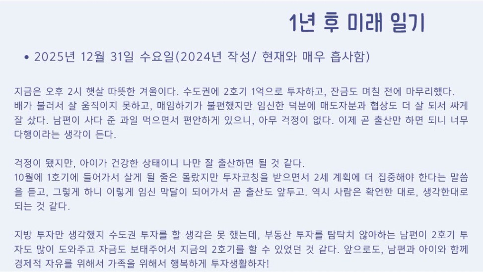 오랜만에 열어본 2024년도 비전보드를 보고 많이 놀랐습니다. 2025년 12월 31일을 가정하고 작성한 1년 후 일기와 현재 상황이 아주 흡사하여 비전보드의 효능에 대해 다시 한번 믿음을 가질 수 있었습니다.