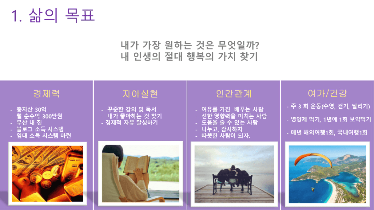 - 인간관계: 주1회 동료에게 안부 묻기, 주1회 가족들과 나들이