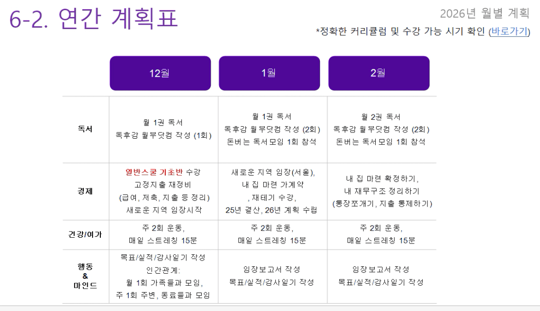 - 투자: 새로운 지역 임장(서울), 내 집 마련 가계약, 재테기 수강, 25년 결산, 26년 계획 수립