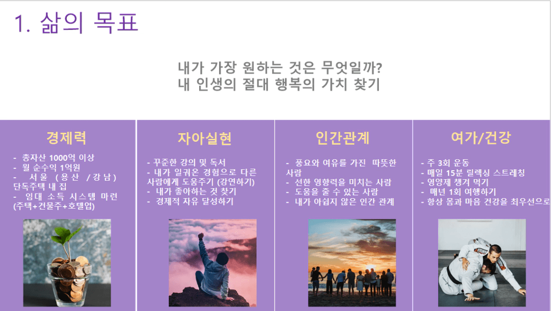 - 건강한 몸과 정신, 크게 스트레스 없고, 경제의 변동에 여유로운 대처가 가능한 삶