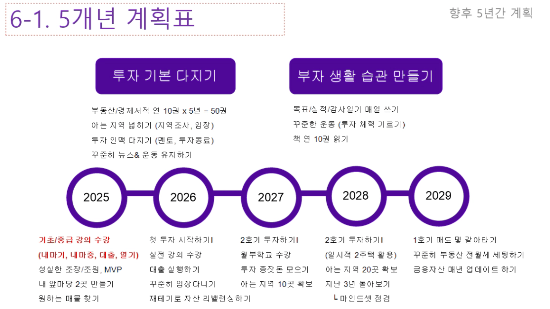 - 투자: 고정지출 재정비 (급여, 이자, 저축 등 정리), 열반 기초반 수강, 새로운 지역 임장시작
