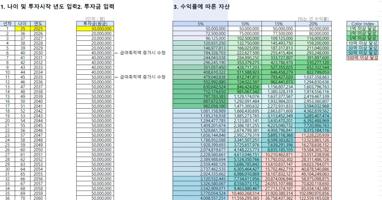 목표 금액 49.8억 (현재 나이 35세, 연저축액 2,000만원, 종잣돈 5천만원 에서 시작)