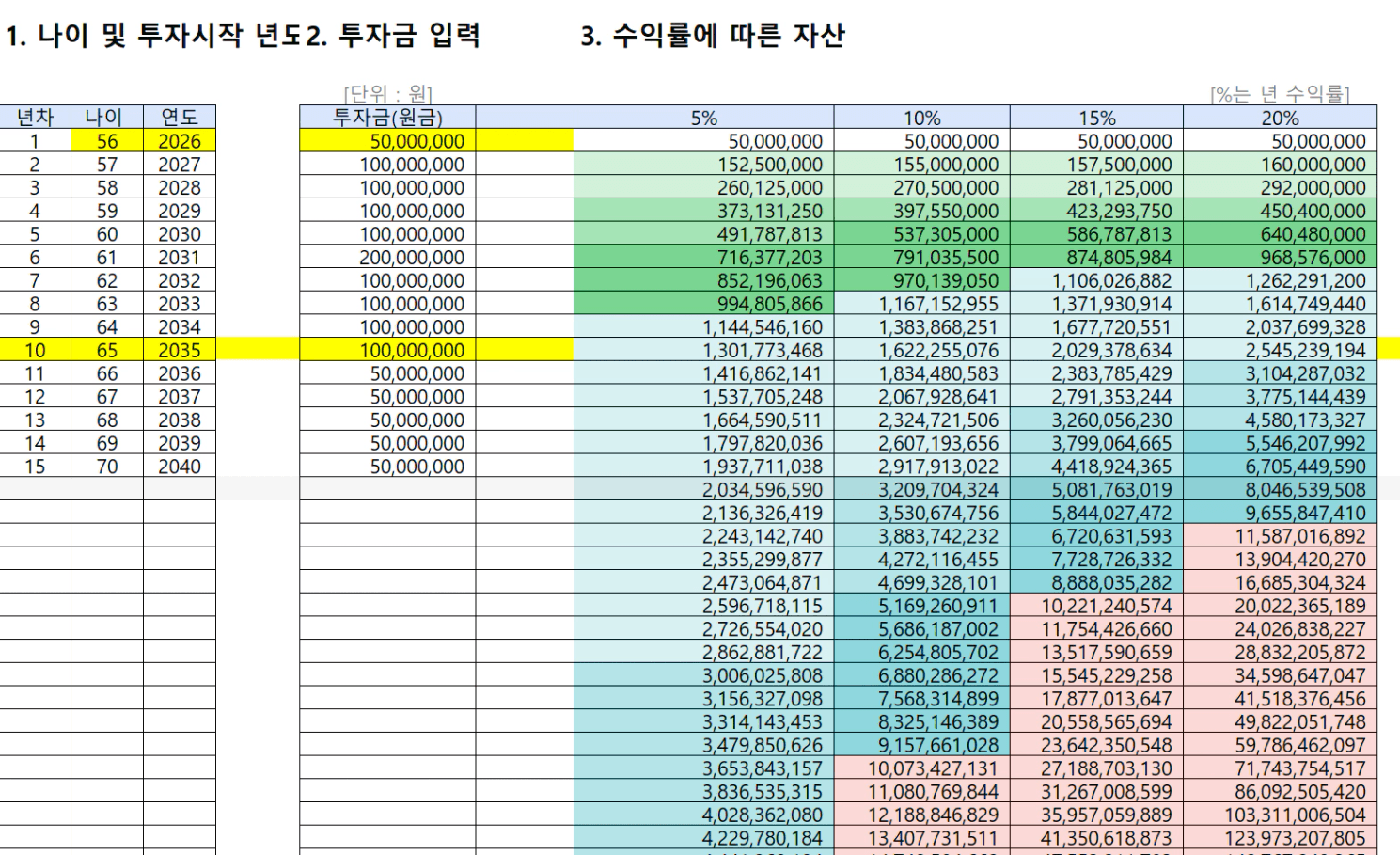 - 수익률 20%: 65세 (2035년)