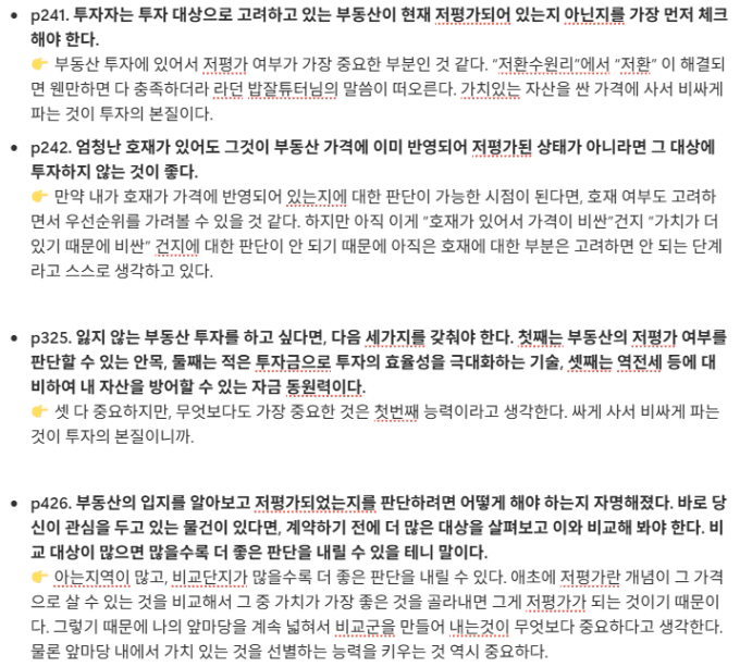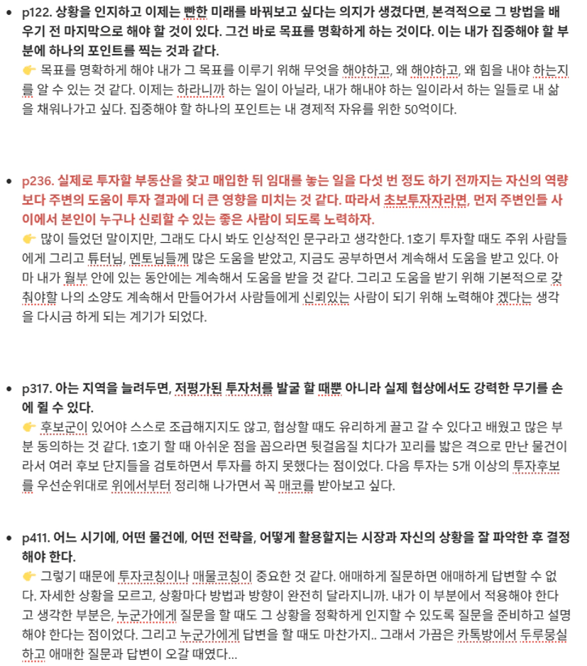 p236. 실제로 투자할 부동산을 찾고 매입한 뒤 임대를 놓는 일을 다섯 번 정도 하기 전까지는 자신의 역량보다 주변의 도움이 투자 결과에 더 큰 영향을 미치는 것 같다. 따라서 초보투자자라면, 먼저 주변인들 사이에서 본인이 누구나 신뢰할 수 있는 좋은 사람이 되도록 노력하자.