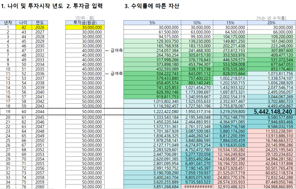 목표 금액 54.5억 (현재 나이 42세, 연저축액 3000만원에서 시작)