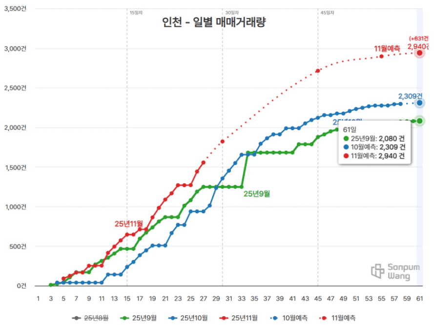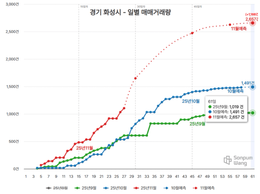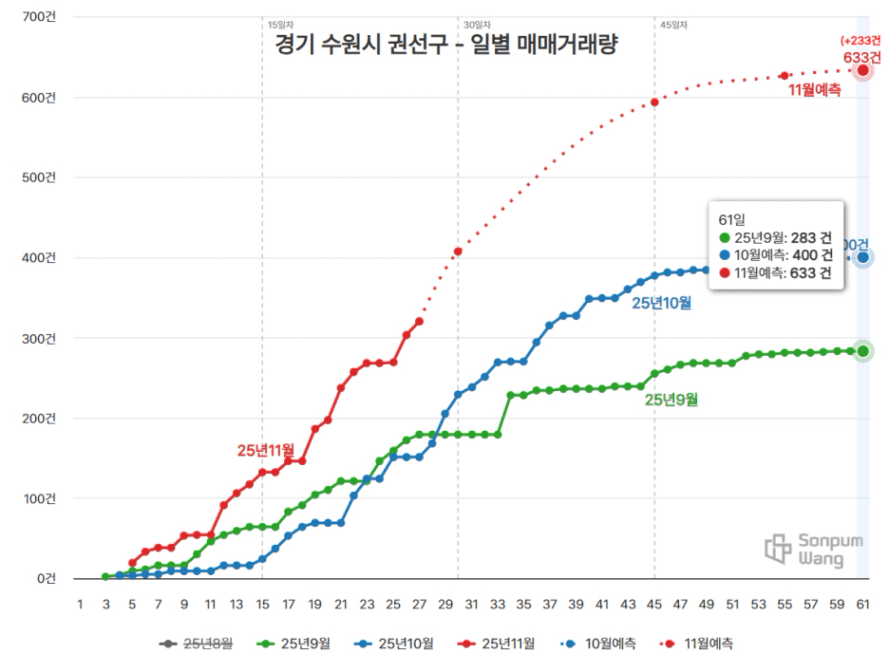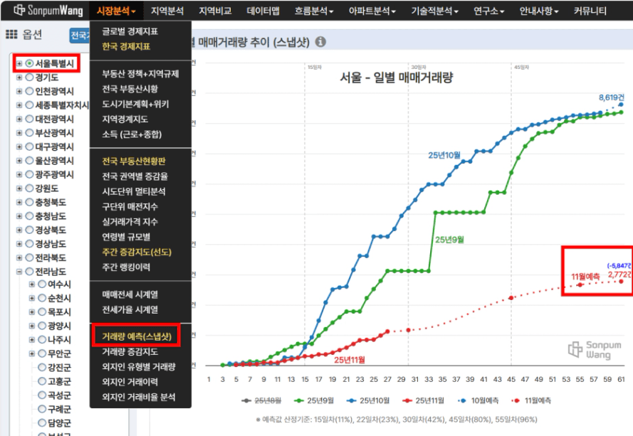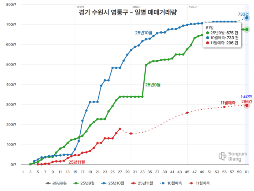 하지만 거래량은 추세가 중요하기 때문에 10월 대비 11월의 거래량이 얼마나 감소하냐 혹은 증가하냐가 해당 지역의 상승 가능성을 판단하는 데 굉장히 중요합니다.