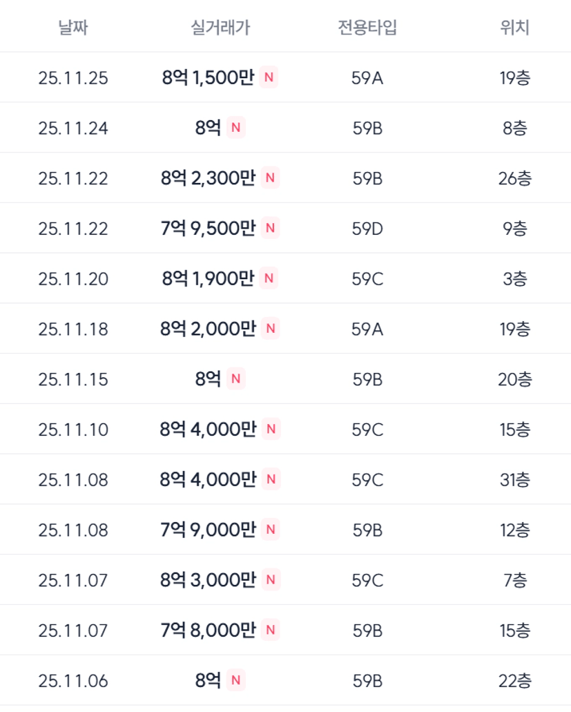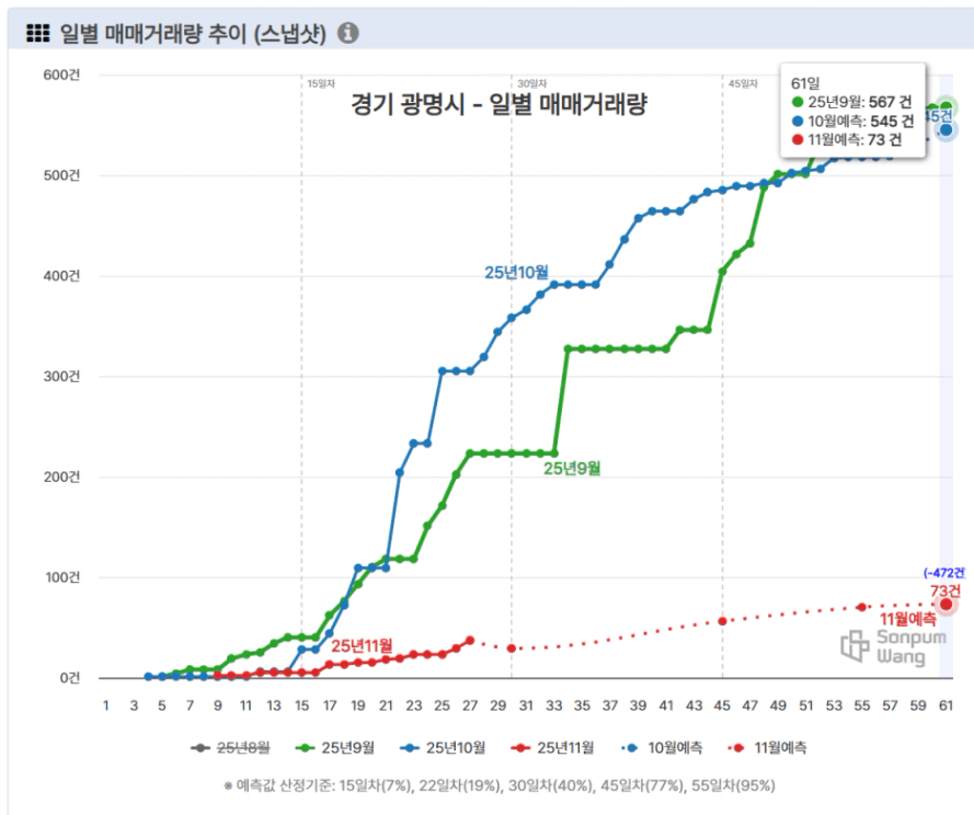그나마 11월에 꾸준히 거래가 있는 광명을 첫 번째 예시로 가지고 왔습니다. 과천이나 분당은 너무 표본이 작아서 예시로 쓰기가 애매하더라고요.