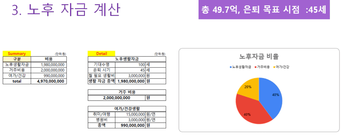 목표 금액 49.7억 (현재 나이 36세, 기존 순자산 + 2027년부터 연저축액 4000만원에서 시작)