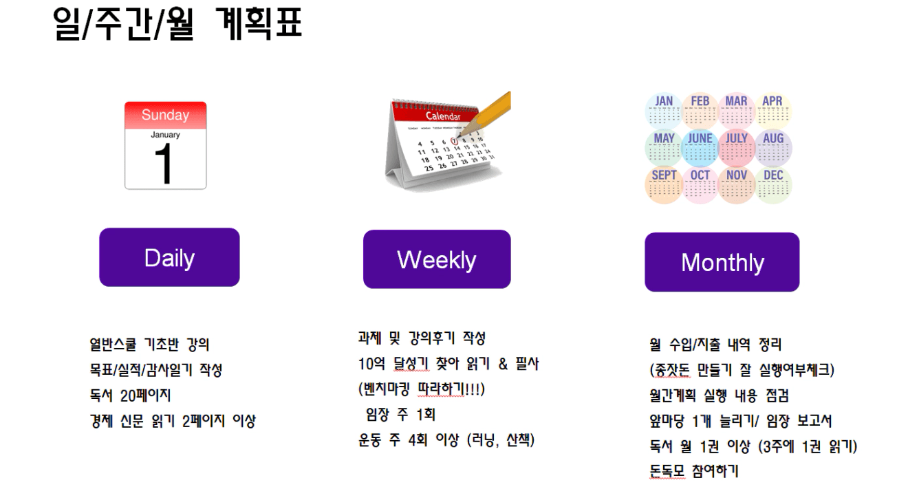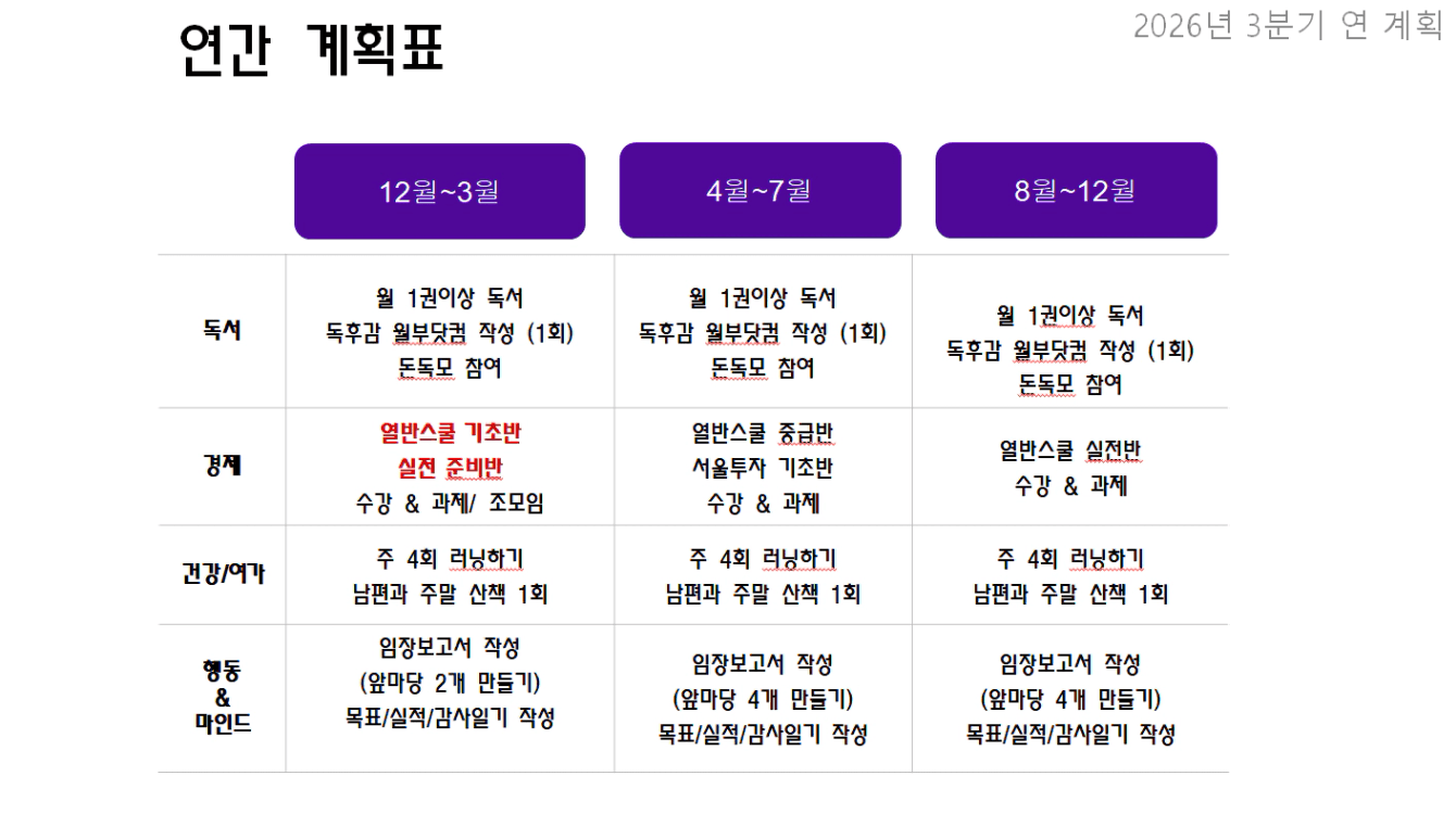 - 건강한 몸을 위해 주 4회 이상 운동 (러닝 또는 요가)