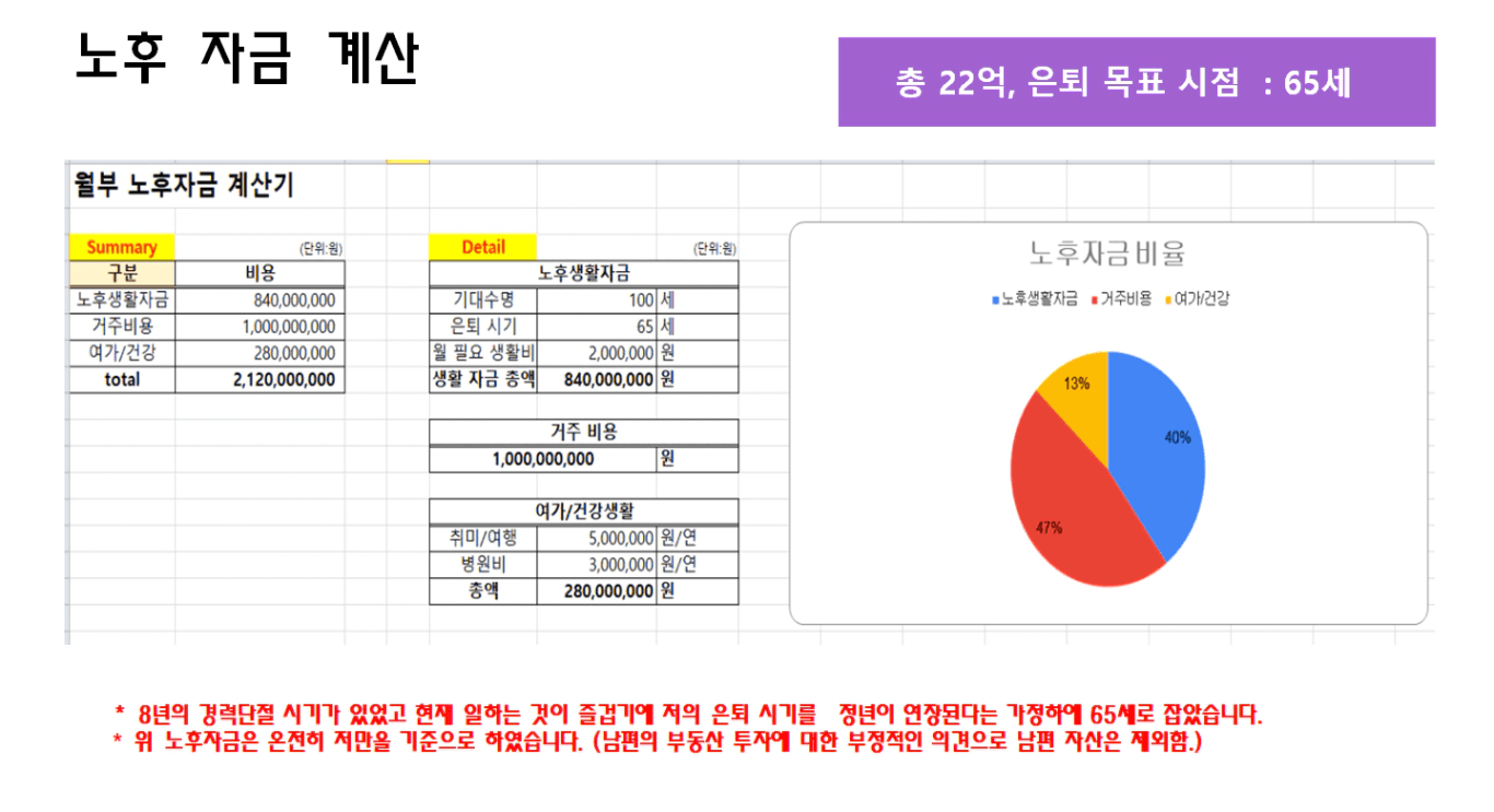 1. 노후 생활 자금: 8.4억 (이 자금은 순전히 저의 노후생활 자금입니다. 남편제외)