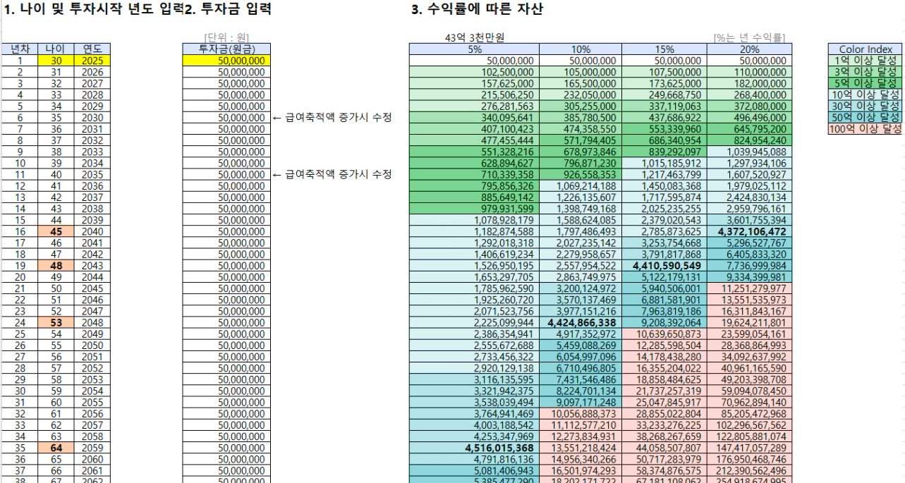 목표 금액 43.3억 (현재 나이 30세, 연저축액 5000만원에서 시작)